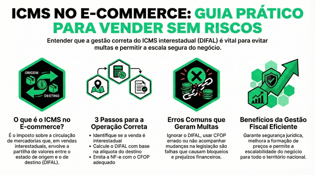 Ao longo deste artigo, você vai entender de forma prática como funciona o ICMS para e-commerce, quais são os principais riscos nas vendas interestaduais e como estruturar sua operação para evitar erros fiscais.